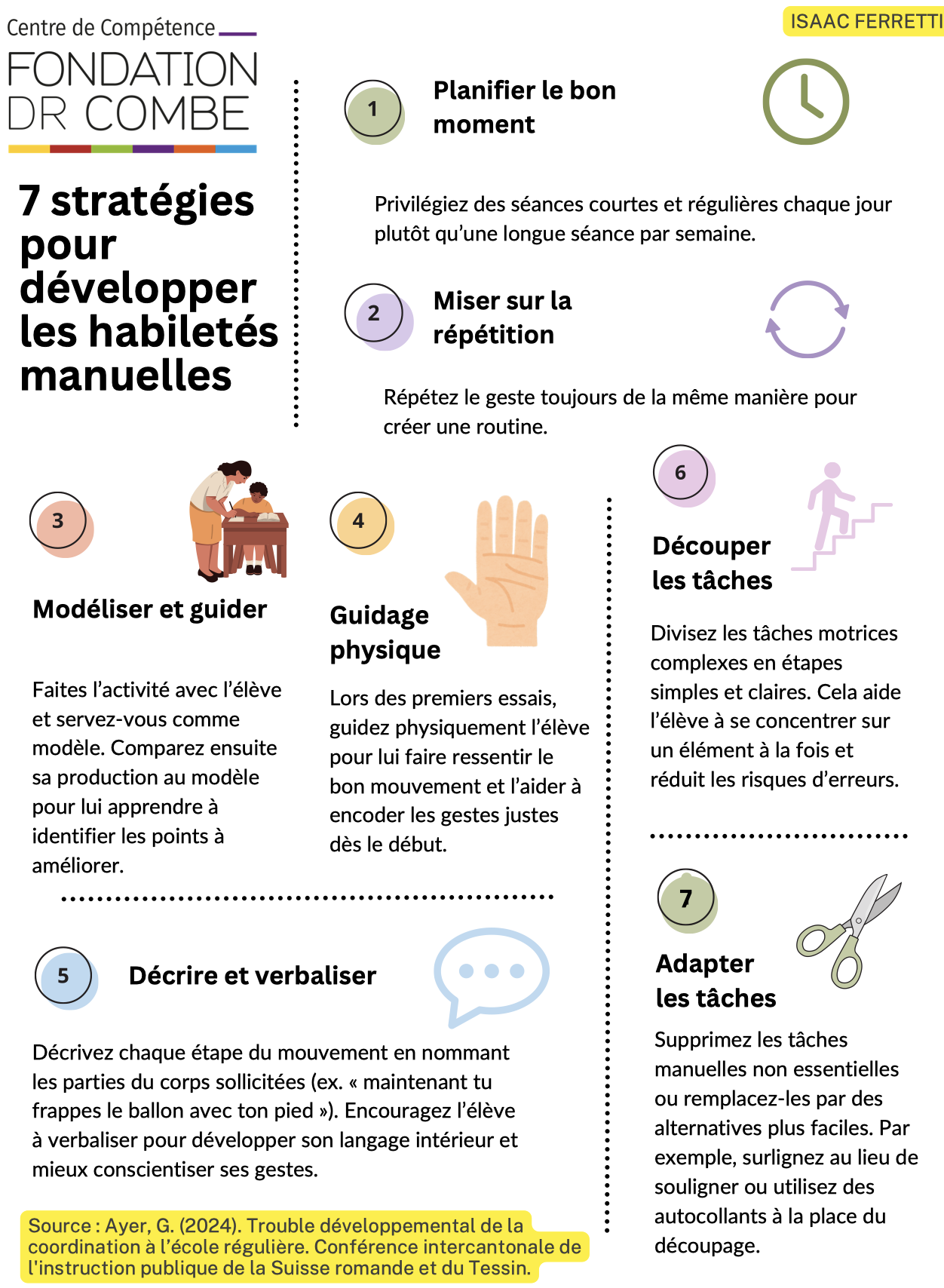 À partir des contenus scientifiques issus de cette recension des écrits, croisés avec les questionnements et les besoins exprimés par les enseignant·e·s lors des interventions du CCDM, le Centre de compétence élabore des infographies thématiques. Ces supports visent à répondre de manière concrète aux défis rencontrés dans l’intégration et la scolarisation des élèves présentant une déficience motrice. Ils ont également pour objectif de soutenir le développement des compétences professionnelles des enseignant·e·s et des équipes éducatives.